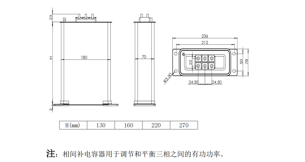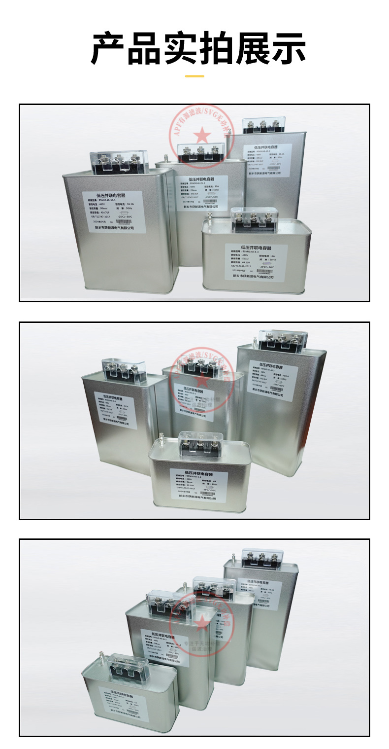 产品描述: 低压并联电容器主要用于电压1kV以下,频率为50Hz~60Hz电容柜的补偿系统,用来提高交流电力系统的功率因数、减少无功损失、改善电能质量。低压并联电容器外形有:方形、椭圆形、圆柱形金。